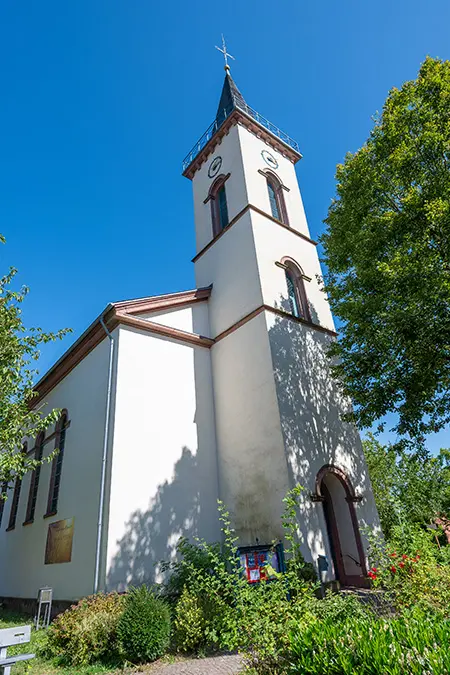 Nach dem Abbruch der alten Kirche im Jahre 1823 erfolgte eine Besichtigung des Baugeländes durch den Darmstädter Baumeister Georg Moller. Nach seinen Plänen erbaute der Darmstädter Landbaumeister Lautenschläger die jetzige Kirche. Die Einweihung erfolgte am 4. September 1825 durch Kirchenrat Wagner aus Darmstadt.