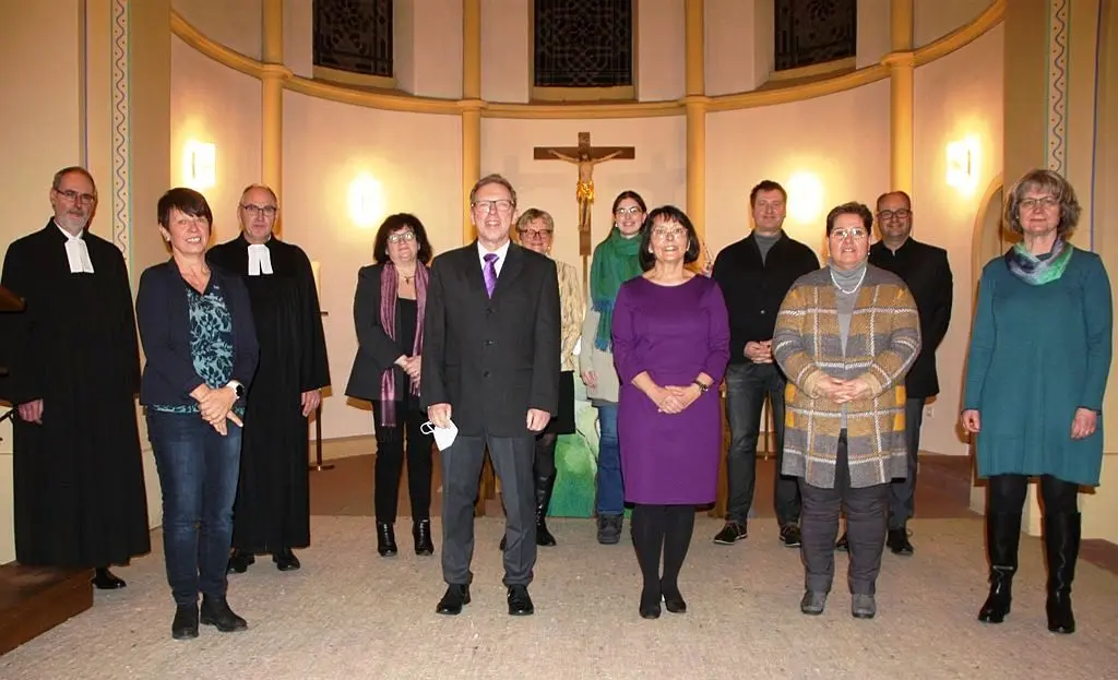 Das Bild links zeigt den DSV in seiner ursprünglichen Besetzung zu Beginn der laufenden Amtszeit; es entstand anlässlich der Einführung durch Propst Arras am 6. Februar 2022 und zeigt (v.l.) Propst Stephan Arras, Elna Singer, Dekan Arno Kreh, Anette Schneider, stellvertretender Präses Dr. Carl-Michael Bergner, Pfarrerin Dr. Irene Dannemann, Maren Fischer, Präses Ute Gölz, Pfarrer Thomas Höppner-Kopf, Sabine Karb, Pfarrer Arne Polzer sowie Dekanin in Stellvertretung Silke Bienhaus.