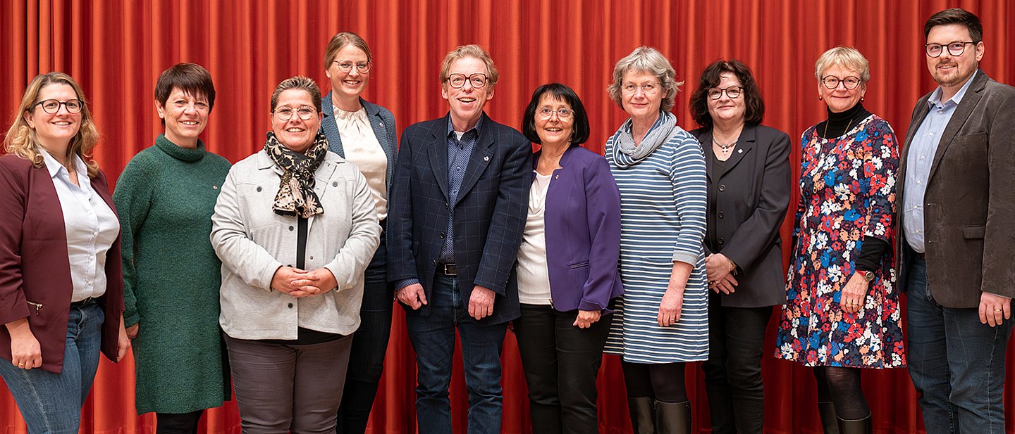 Der Dekanatssynodalvorstand (DSV) setzt sich zurzeit aus folgenden Frauen und Männern zusammen – unser Bild, das bei der Dekanatssynode am 1. November 2024 entstanden ist, zeigt (v.l.) Pfarrerin Jasmin Setny, Elna Singer, Sabine Karb, Dekanin Sonja Mattes, stellvertretender Präses Dr. Carl Michael Bergner, Präses Ute Gölz, Dekanin in Stellvertretung Silke Bienhaus, Anette Schneider, Pfarrerin Dr. Irene Dannemann und Pfarrer Dr. Dominik Weyl. Auf dem Bild fehlt Maren Fischer.